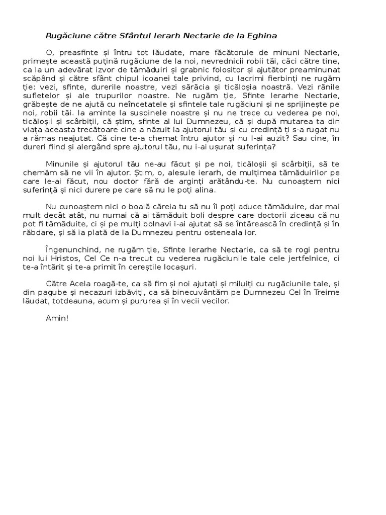 O, preasfinte și întru tot lăudate, mare făcătorule de minuni nectarie, primește această puțină rugăciune de la noi, nevrednicii robii tăi, căci către tine, ca la un adevărat izvor de tămăduiri și grabnic folositor și ajutător preaminunat scăpând și. . 09.11.2021 · cea mai puternică rugăciune tămăduitoare către sfântul nectarie din eghina, vindecătorul bolnavilor de cancer şi alte boli grele de georgiana adam | 09 noi 2021 • 07:00 de sărbătoarea cu cruce neagră din calendar ortodox sfântul nectarie din eghina, creştinii ortodocşi pot rosti cea mai puternică rugăciune, despre care se spune că este vindecătoarea tuturor bolilor grele.