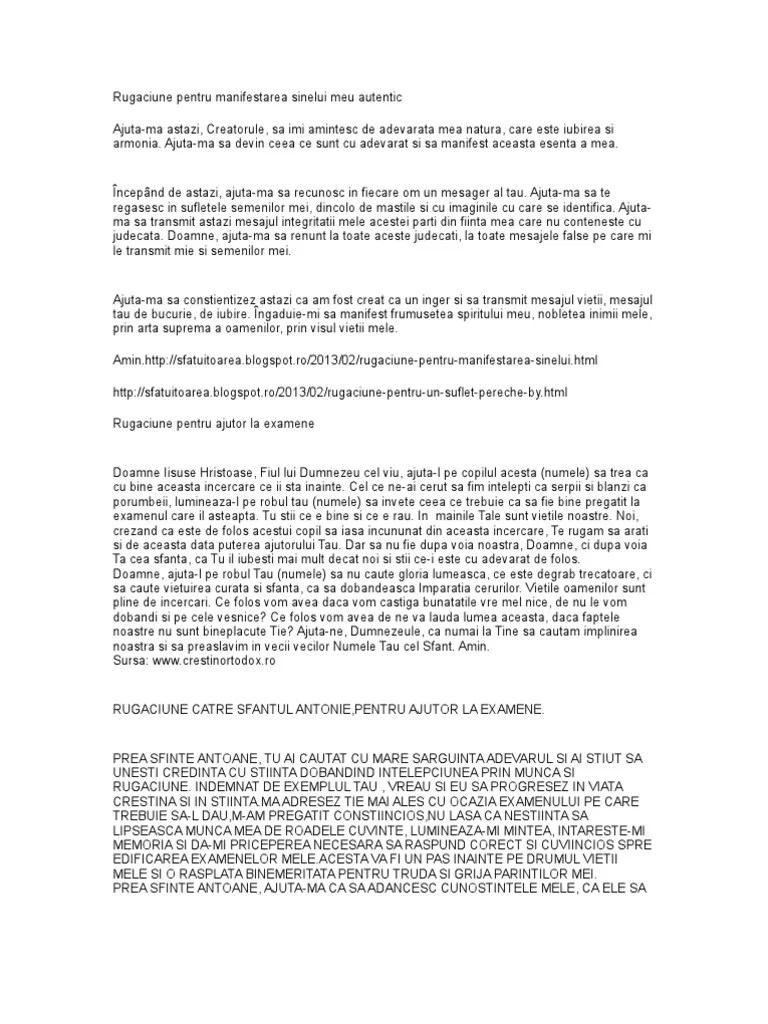 27.11.2009 · rugaciune pentru ajutor la examene. Rugăciunile vin în ajutorul celor care trec prin examene în această perioadă. Indemnat de exemplul tau , vreau si eu sa progresez in viata crestina si in stiinta.ma adresez tie mai ales cu ocazia examenului pe care. O rugăciune pentru examene se rostește ori de câte ori ai de trecut un moment important. Tu stii ce e bine si ce e rau. Nu ai nevoie neapărat de o anumită rugăciune. Prea sfinte antoane, tu ai cautat cu mare sarguinta adevarul si ai stiut sa unesti credinta cu stiinta dobandind intelepciunea prin munca si rugaciune.. Prea sfinte antoane, tu ai cautat cu mare sarguinta adevarul si ai stiut sa unesti credinta cu stiinta dobandind intelepciunea prin munca si rugaciune.