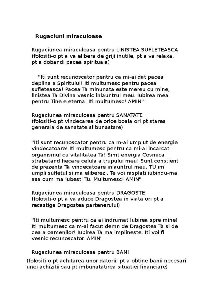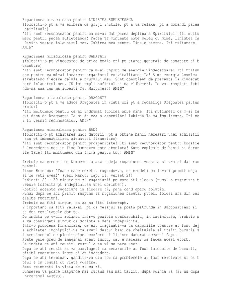 Trebuie sa o spui in fiecare vineri, timp de 9 saptamani. Trebuie sa o spui in fiecare vineri, timp de 9 saptamani. 16.02.2018 · rugaciunea grabnic ajutatoare care te scapa de orice problema. Rugăciune pentru pace și liniște sufletească. Omul care vorbește sincer cu dumnezeu se simte ușurat și despovărat în mod aproape miraculos. 26.01.2014 · rugăciune pentru liniște sufletească. Ea poate fi cuprinsă în pravila de rugăciune zilnică a oricărui creștin ortodox. Trebuie sa o spui in fiecare vineri, timp de 9 saptamani.